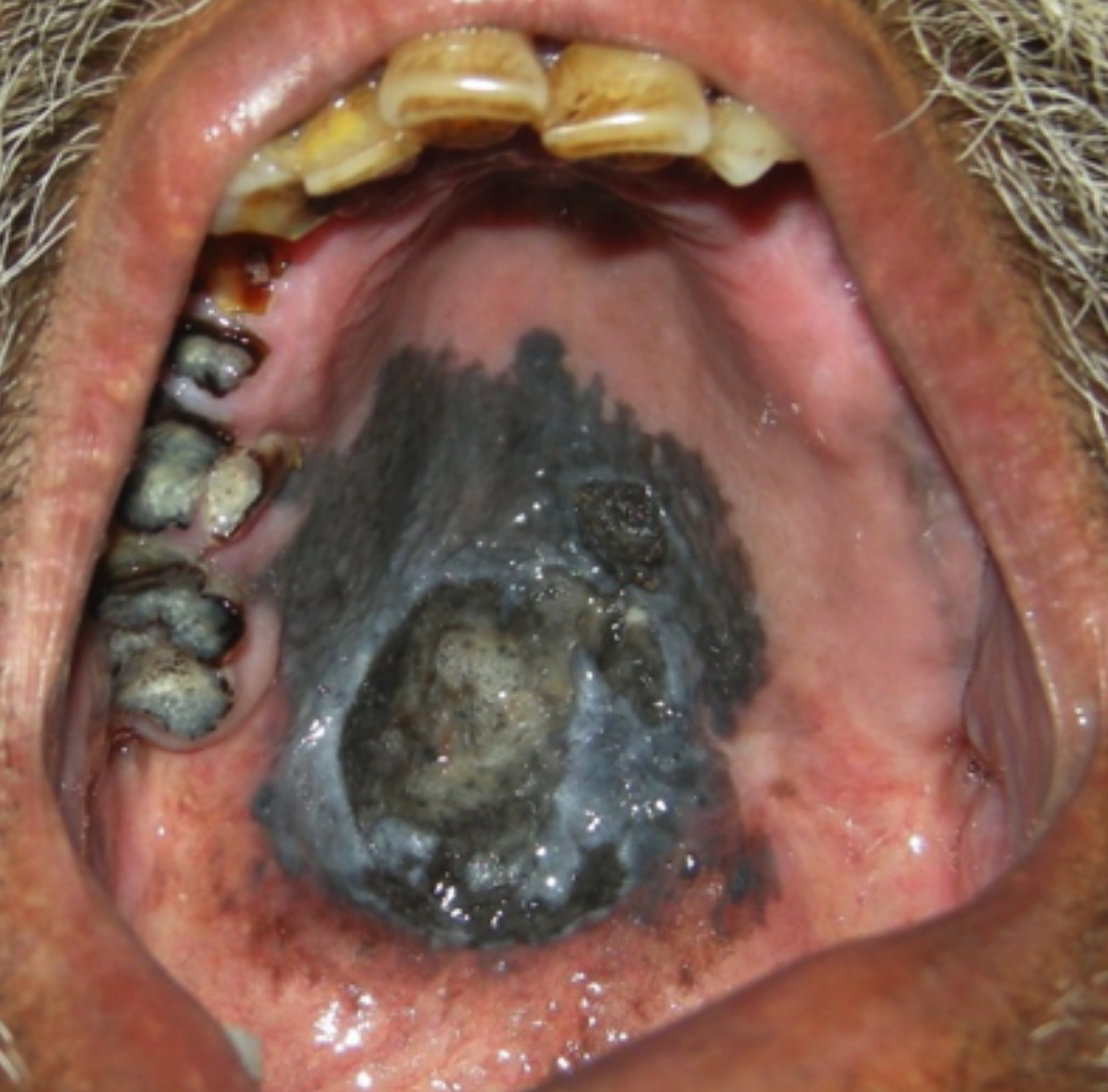 A 48-year male reported with a complaint of brownish-black pigmented area over the hard palate. Patient did not have pain or burning sensation. He was mostly concerned with his aesthetic appearance. Initially, he noticed a small patch of dark black pigmented area four months back that has increased to present size. There was a rapid spread of the lesion which covered the entire palatal region. On clinical examination, the lesion, was dark-blackish to brownish in color with irregular borders that was well demarcated from the surrounding area. The lesion mostly involved the left to central part of the hard palate, extending anterioposterorly from middle third to junction of the hard and soft palates. The surface appeared wrinkled, granular with a round proliferative elevated area seen in mid-palate region (Figure 1). On palpation, the lesion was fibrotic, non-scrapable and non-tender. The regional lymph nodes were not palpable. Based on the clinical examination and tumor size (tumor >2 cm but not >4 cm) with no involvement of lymph nodes, it was staged as T2, N0, M0 as per TNM staging.