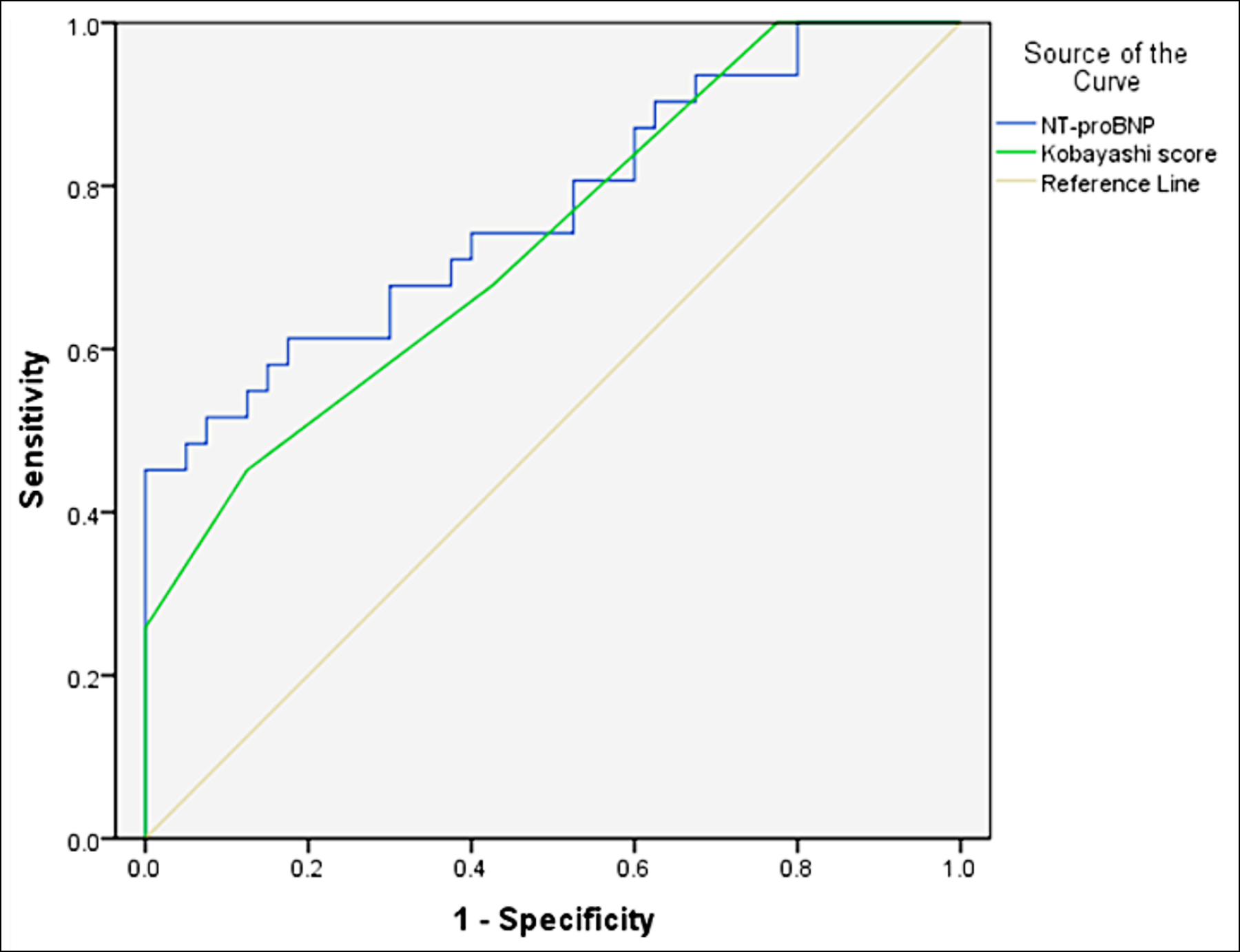 Draw the ROC curve of NT-proBNP and Kobayashi's diagnostic score showing that the AUC areas of NT-proBNP and Kobayashi's score are 0.771 and 0.732, respectively. PNT-proBNP <0.001 and PKobayashi's score = 0.001, as shown in Figure 1. According to the Youden index, the optimal critical values were 543.12 ng / L and 7.50 points, respectively. The sensitivity was 51.6% and 45.2% respectively, and the specificity was 92.5% and 87.5%, respectively.