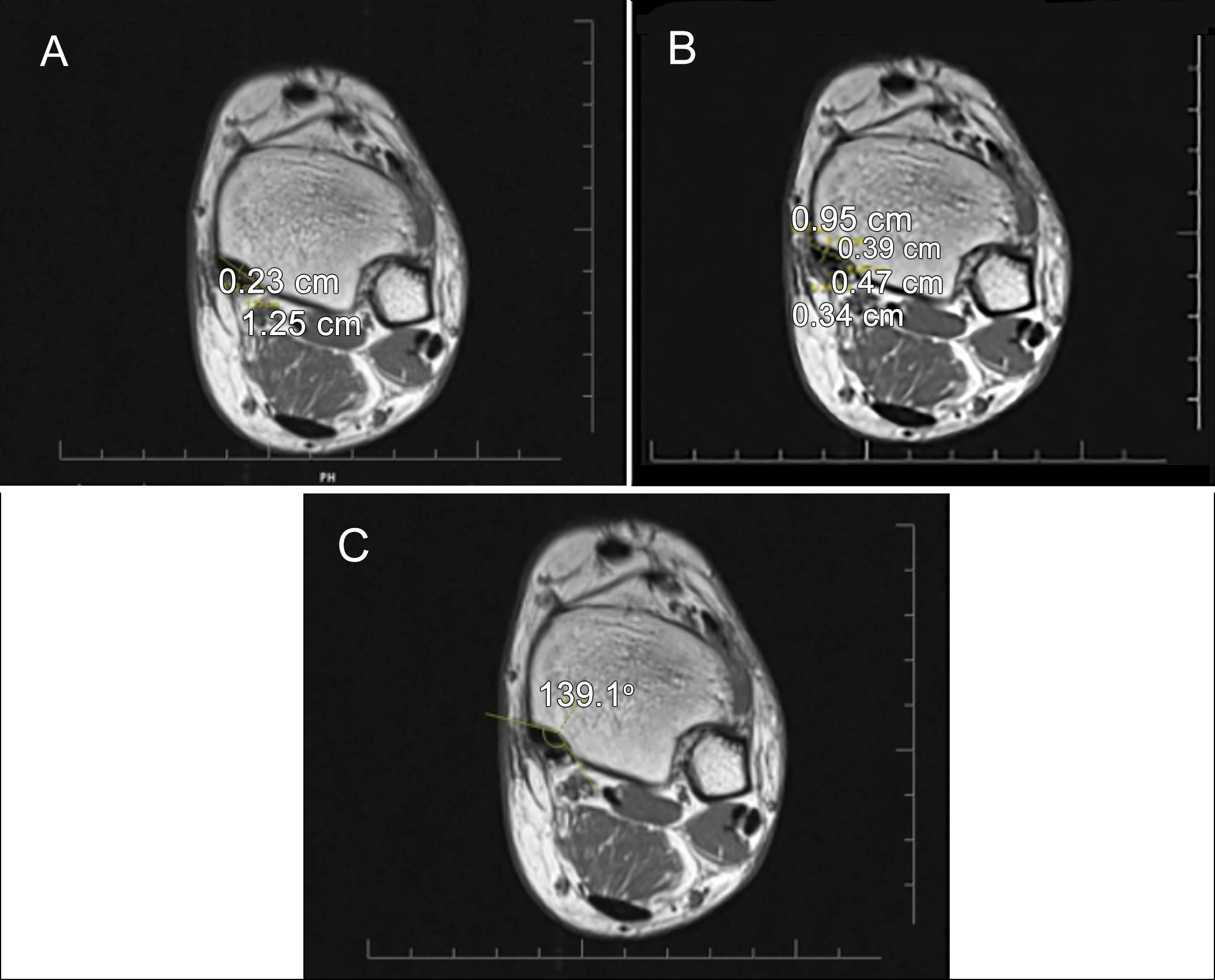 PTT subluxation and dislocation, secondary to the high energy traumas or the anatomical structure of MMG, have been previously reported. In such patients, diagnosis may be delayed, and the tendon can move anteriorly and medially over MM.1,12,13 Cases presenting with dislocation due to the presence of bilateral convex MG have also been previously described.14 MMG deepening is a surgical procedure recommended in the literature, although there is no complete consensus on its use in PTT dislocation.15 In daily magnetic resonance imaging (MRI) experience, PTT and the flexor digitorum longus tendon (FDLT) are generally oval in shape and extend into the groove. In addition, the MMG depth and length differ among the individuals.