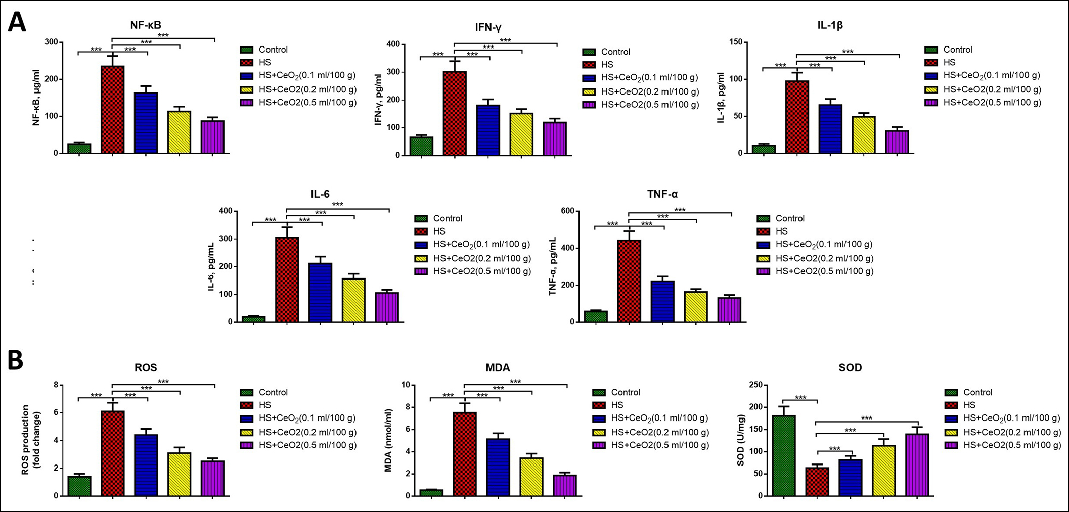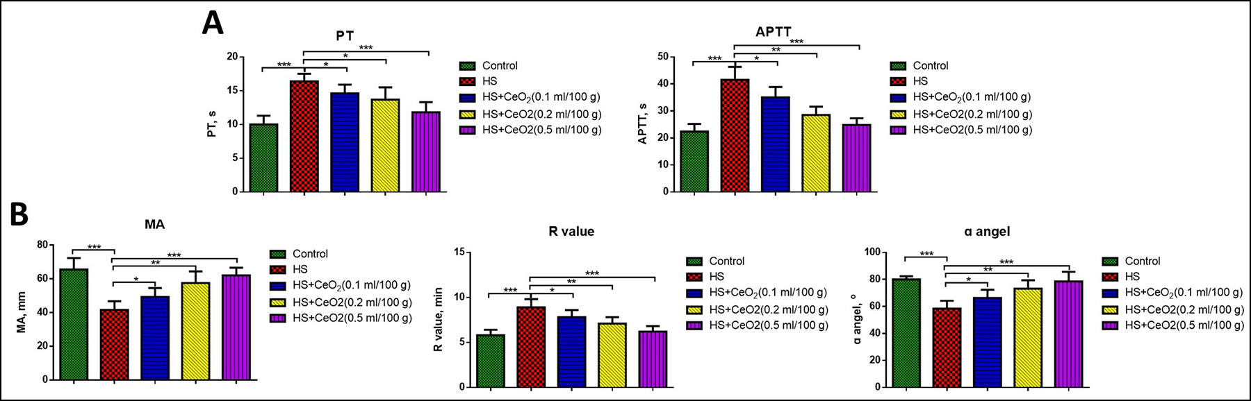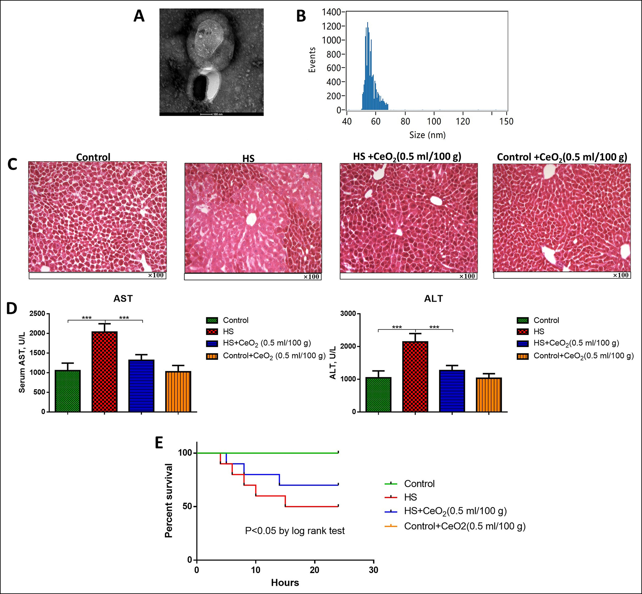 Methodology: HS mice were treated with different doses of CeO2 nanoparticles suspension (1 mg/ml), 0.1 ml/100 g, 0.2 ml/100 g, 0.5 ml/100 g. Levels of NF-κB, IFN-γ, IL-1β, IL-6, and TNF-α in tissue homogenate were measured by ELISA. Oxidative stress-related factors in liver tissue homogenate were also evaluated. Coagulation function was determined by measurement of the prothrombin time (PT) and activated partial thromboplastin time (APTT) as well as using thromboelastography analysis. Serum alanine aminotransferase (ALT) and aspartate aminotransferase (AST) were detected for liver function. Survival analysis within 24 hours after the model establishment was conducted by K-M curve.