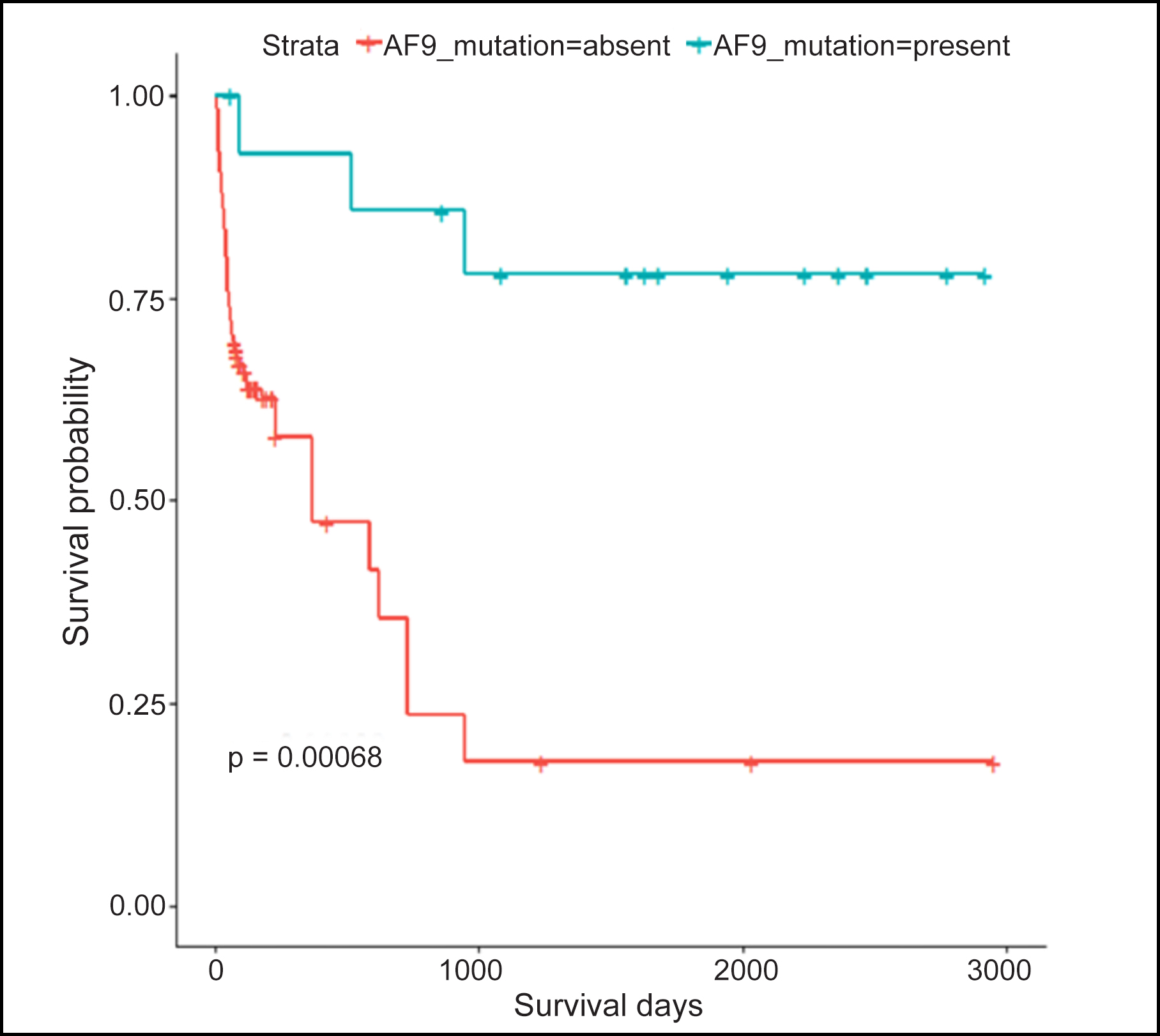 Figure 1: Kaplan Meir for survival days and MLL::AF9 gene rearrangement.