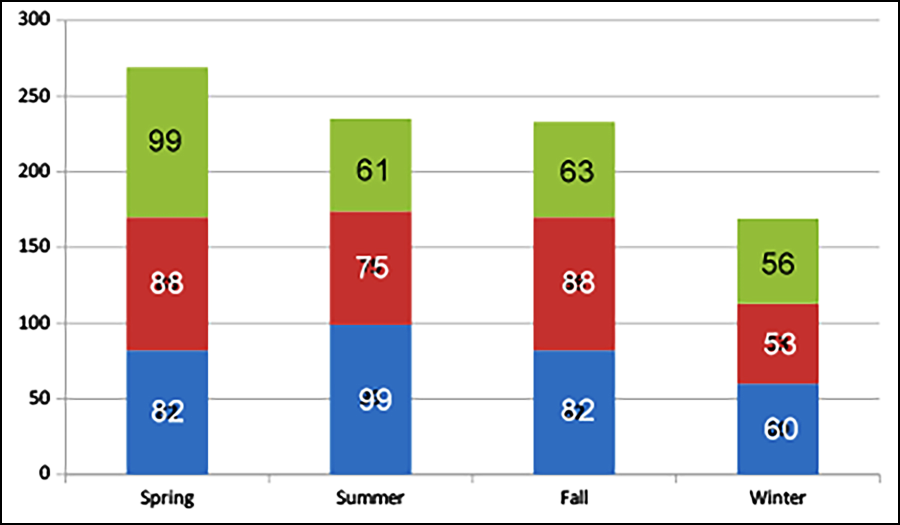 Figure 2: Seasonal and monthly distribution of hospital presentations due to animal contacts with suspicion of rabies.