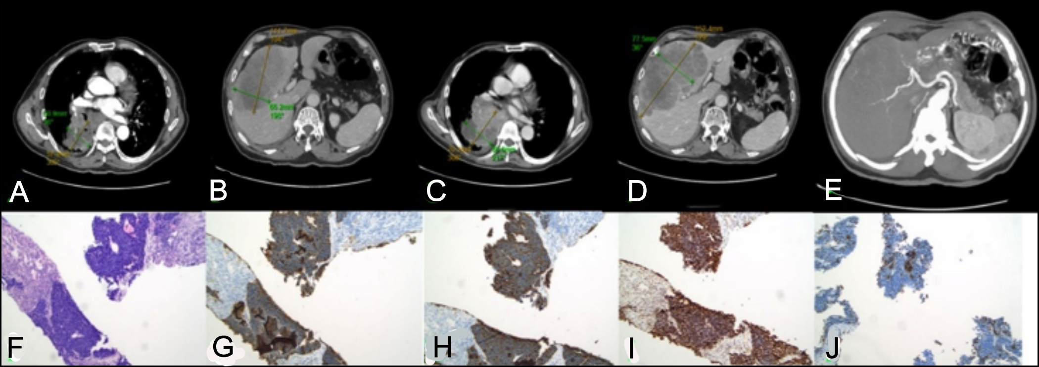 A male patient was admitted on May 26, 2024, with persistent cough. The CT scan revealed tumours in the right lung and liver (Figure 1A, B). Pathologic and immunohistochemical analysis of lung tissue suggested lung adenocarcinoma, supporting a preliminary diagnosis of lung adenocarcinoma with hepatic metastases. Notably, serum neuron-specific enolase (NSE) was significantly elevated (>740.00 ng/mL; normal: <16.50 ng/mL). Following a gastroenterology consultation, a CT-guided liver biopsy was performed on July 1, demonstrating the following profile: P-CK (-), CK7 (-), TTF-1 (-), Napsin A (-), P40 (-), CK5/6 (-), P63 (-), SMARCA4 (+), CD56 (+), chromogranin A (CgA) (+), synaptophysin (Syn) (+), Ki-67 (+, about 20%) (Figure 1F-J). When the CT scan and gastrointestinal endoscopy ruled out extrahepatic NETs, a comprehensive analysis of imaging, pathology, and clinical features ultimately confirmed grade 3 (G3) PHNETs. To reconfirm the result, Ga-68 DOTATATE scan was recommended; however, the patient declined the examination due to financial constraints. On July 11, the patient initiated two cycles of chemotherapy and immunotherapy (etoposide 140 mg, carboplatin 0.4 g, toripalimab 200 mg, and octreotide acetate microspheres 20 mg). The follow-up CT on September 14 reported disease progression (Figure 1C and D). Transarterial chemoembolisation was deferred due to declining haemoglobin (78 g/L). Unfortunately, the patient passed away two months later.