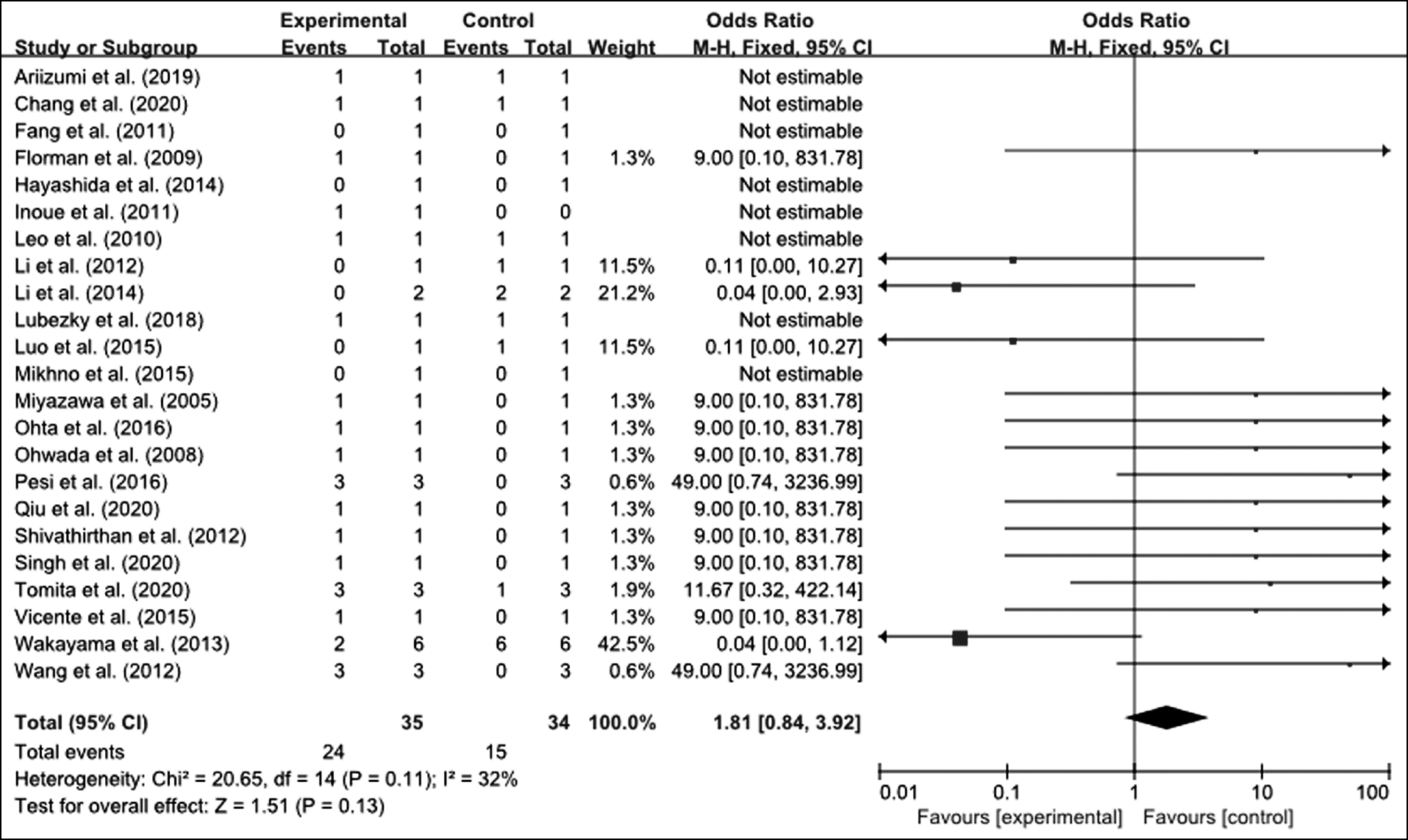 IBM SPSS statistics 22 software was used for the statistical analysis. The measurement data were expressed as mean ±standard deviation and median (range), while categorical data were given as numbers and percentages. The categorical variables were compared by chi-square or Fisher exact test with continuity correction. The value of p<0.05 was considered statistically significant. The heterogeneity was determined by an I2 method, and I2 >50% with p<0.1 was considered a significant heterogeneity. A RevMan version 5.5.1.0 was used to draw a forest plot.