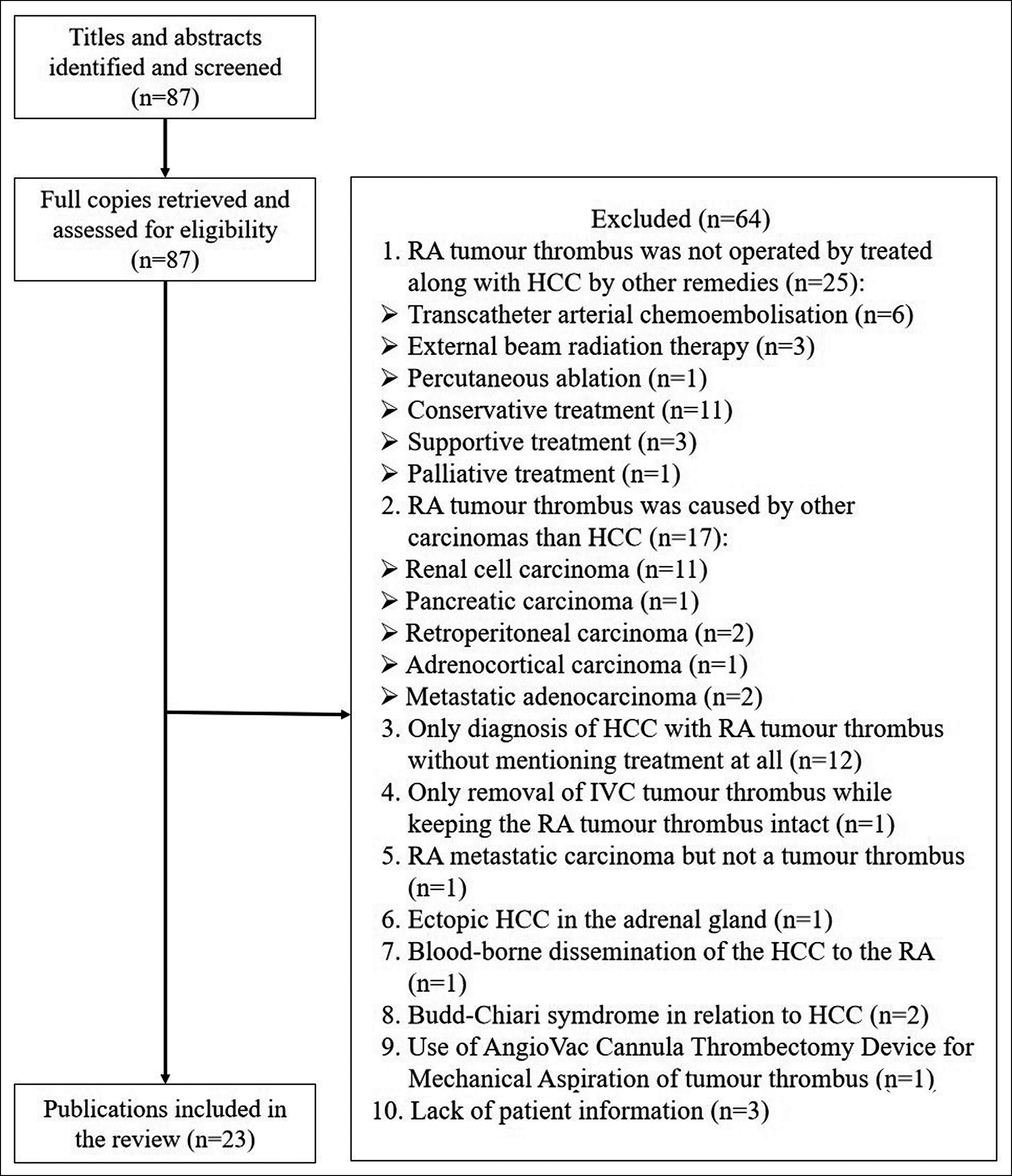 The MEDLINE, EMBASE, and Cochrane databases were comprehensively retrieved for studies published between January 2000 and December 2021. The search terms and keywords included hepatocellular carcinoma, hepatectomy, tumour thrombus, right atrium, total hepatic vascular exclusion, cardiopulmonary bypass, and cardiac surgical procedures. Additional studies were also sought by reviewing the reference lists of the recruited publications and conference abstracts. A careful retrieval was made to try to seek randomised controlled trials that described HCC with tumour thrombus extending to the IVC and RA. Retrospective studies, case series and case reports on HCC with RA tumour thrombus were also included. The exclusion criteria were RA tumour thrombus not treated surgically, RA tumour thrombus caused by other carcinomas, and details of surgical treatment of HCC with RA tumour thrombus not being available (Figure 1).