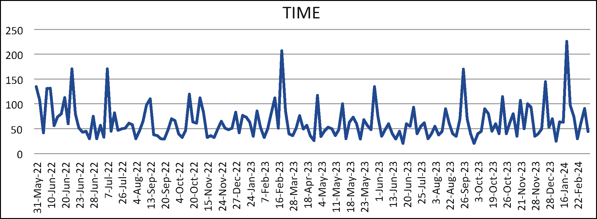 A total of 156 cases of robotic-assisted cholecystectomy were performed between 29th May 2022 and 31st March 2024. Of which, 129 (82.69%) were in ASA Class 1 and 27 (17.31%) were in Class II. The mean age of patients in the study was 45.23 ± 14.35 years; 41 (26.28%) were male, and 115 (73.71%) were female. There were three conversions to laparoscopic surgery due to dense adhesions and oedematous gallbladder. The mean console time for the first 30 cases was 73.86 minutes; however, it decreased to 64.22 minutes for the next cases. The overall mean console time was 63.04 ± 33.14 minutes, with time ranging from 20 minutes to 226 minutes in the longest case. This variation after the initial cases seemed to be attributable to the patient’s gender and gallbladder characteristics, especially the presence of cholecystitis, rather than the skill or learning curve of the patient. However, a variation among genders appeared; the mean operative time was shorter in females (61.00 minutes) as compared to men (73.43 minutes). Console time over the study period is given in Figure 2.
