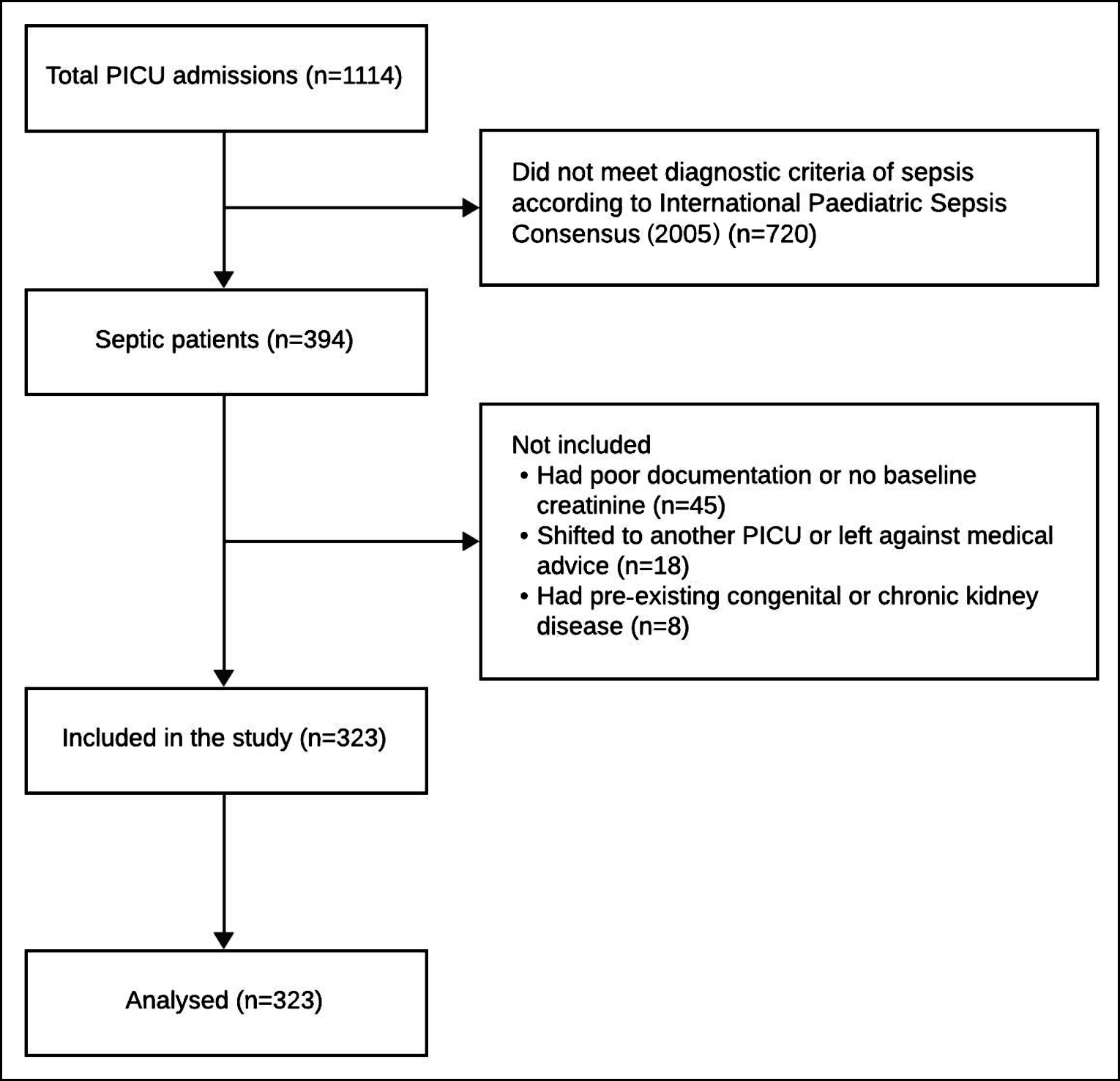 This was a descriptive study conducted at the Department of Paediatrics, The Aga Khan University Hospital, Karachi, Pakistan. It included patients aged 1 month to 18 years who met the diagnostic criteria of sepsis (suspected or confirmed infection with the presence of Systemic Inflammatory Response Syndrome), according to the International Paediatric Sepsis Consensus (2005).13 Moreover, they were admitted to the PICU from January 2021 to June 2022. Children with pre-existing chronic kidney disease, missing baseline creatinine level measured at PICU admission, or those with record of kidney transplant or renal replacement therapy (RRT) within the past year were excluded. The OpenEpi software was used to determine the sample size.