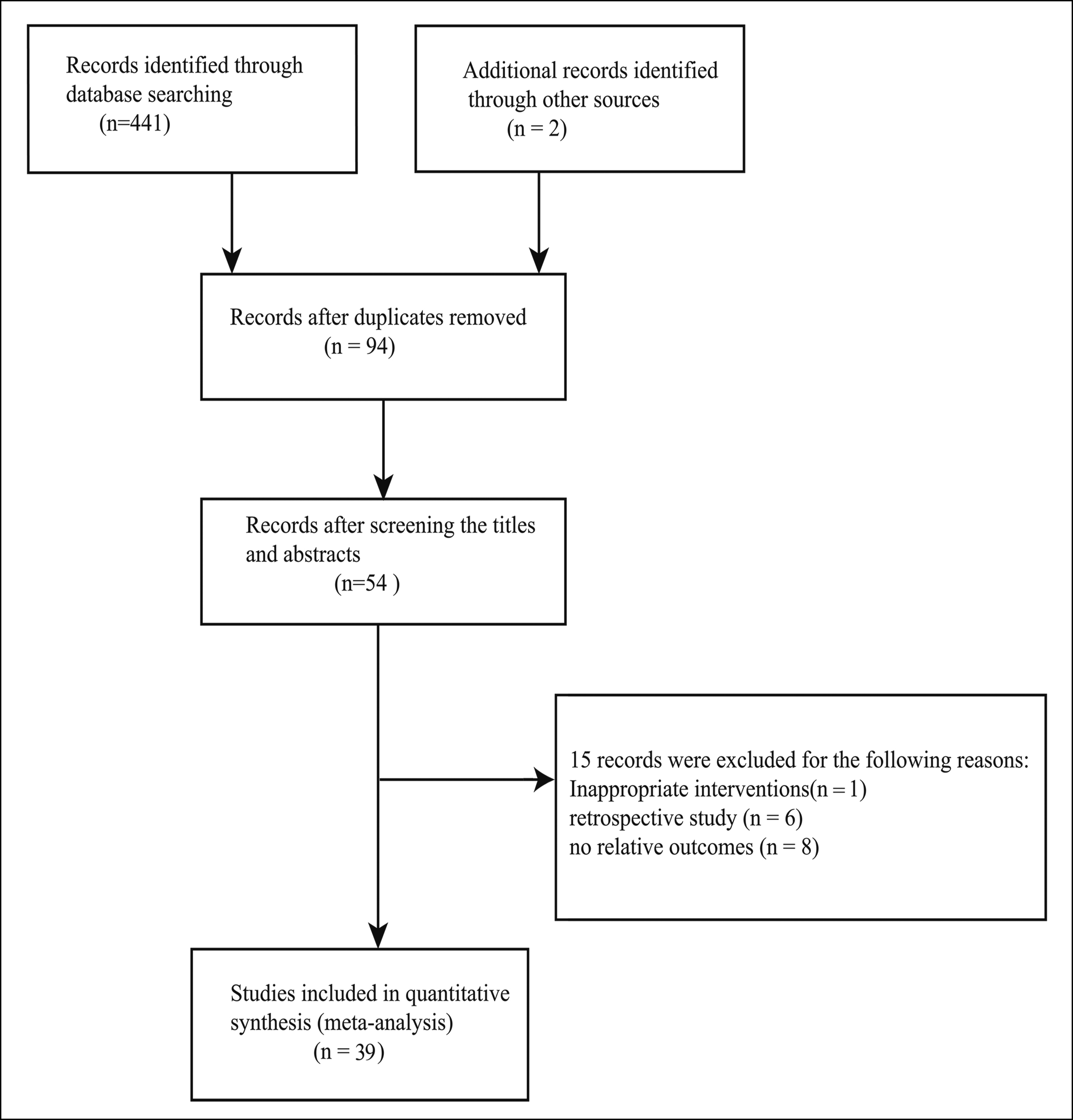 Based on the search criteria, the initial database search identified 443 potentially relevant possible studies. A total of 54 Records were identified after removing duplicates and screening the titles and abstracts. Fifteen trials were excluded for the following reasons: Retrospective study (n = 6), no relative outcomes (n = 8), and duplicate data (n = 1). Finally, 39 clinical trials were involved in this meta-analysis. The flowchart of the detailed searching steps for this meta-analysis is described in Figure 1.