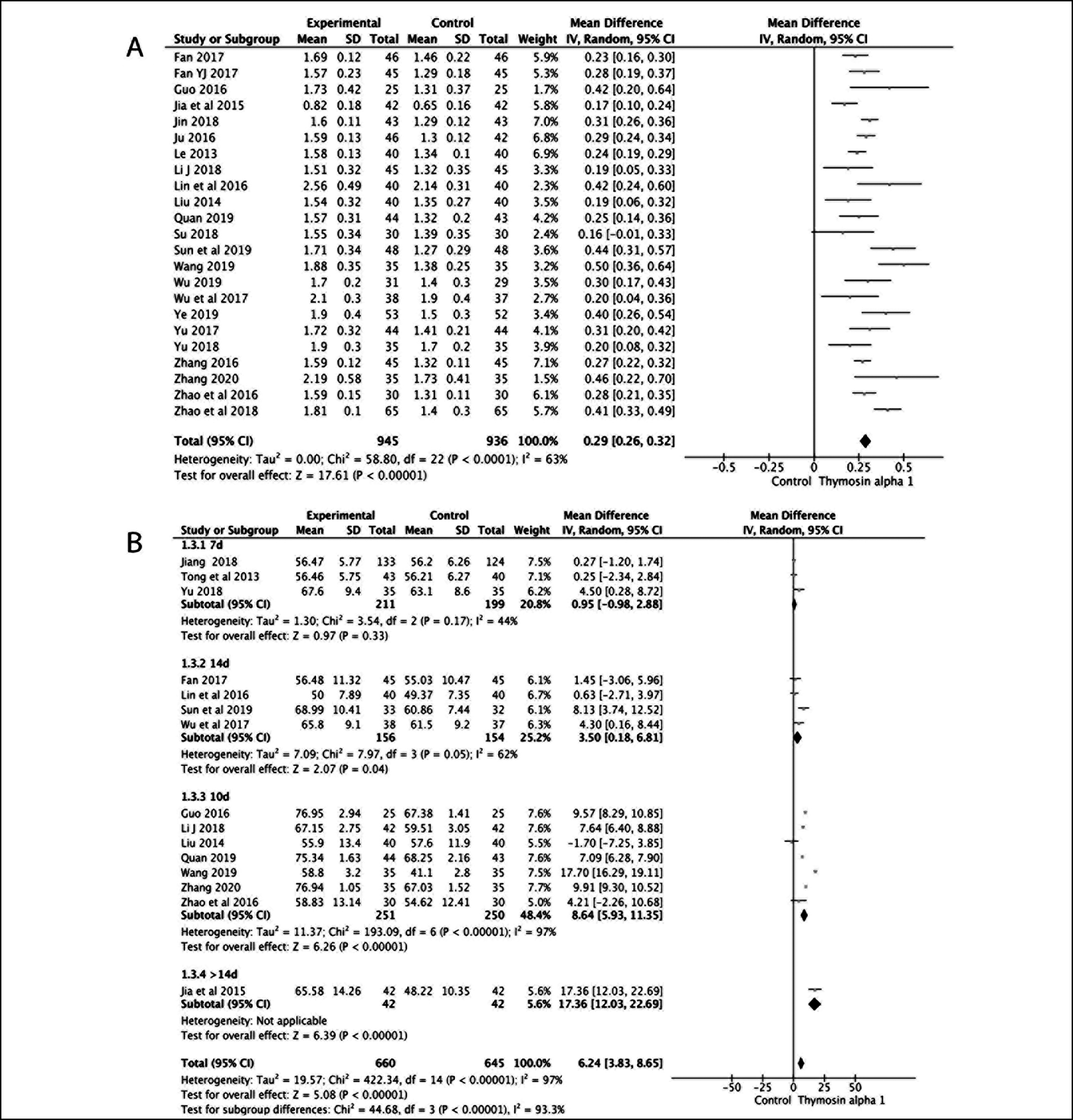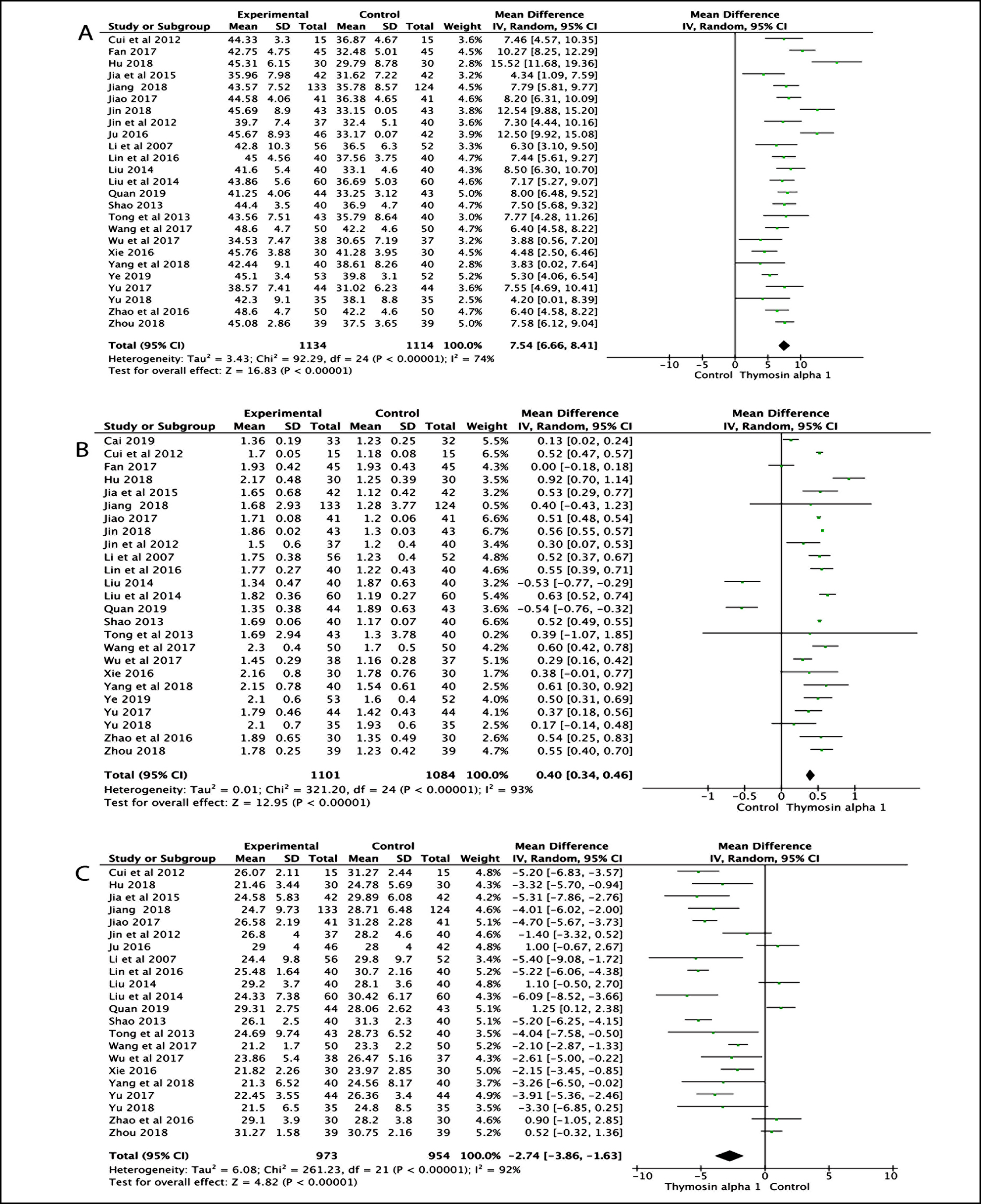 This study has certain limitations. First, the bias risk of many studies was unknown. Risk of bias assessments for the randomisation and concealment allocation were frequently inadequate. Second, the thymosin alpha 1 intervention protocol, including frequency and sessions, varied greatly across studies. This could influence the reliability of the pooled effect sizes and make it difficult for the review authors to draw a definitive conclusion about the optimal recommendation. Third, the meta-analysis showed considerable evidence of heterogeneity between trials. The average illness severity, and age differed from trial-to-trial and the diversity of treatment options might be the source of heterogeneity. Considering the lack of literature and relevant data, the authors did not conduct subgroup analyses. Therefore, more well-designed trials in the near future are a feasible solution to remedy this flaw.