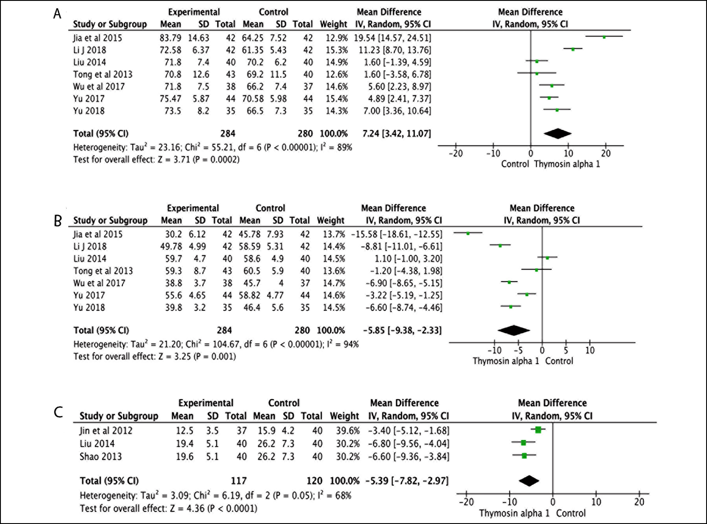 Seven studies involving 564 participants were included in the meta-analysis to explore the impact of thymosin alpha 1 on arterial blood gases by random-effects model.9,14,18,35,36,39,41