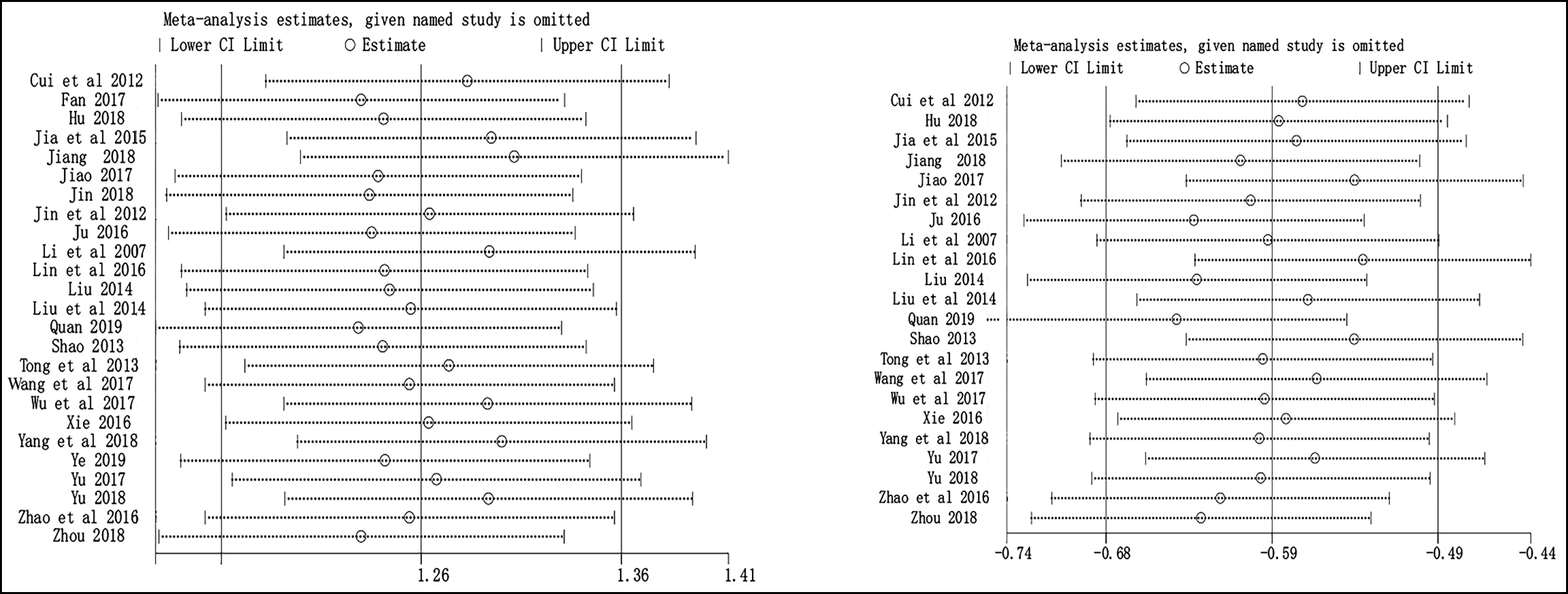 A single study involved in the meta-analysis was deleted each time, and the rest was reanalysed, resulting in similar results compared with the previous ones, indicating that the present study’s results were statistically robust. For further verification, the authors implemented a sensitivity analysis of the CD4+ and CD8+ T lymphocyte count by Stata 14.0. Figure 6 indicated that the outcomes were very similar, and had relatively good stability. The funnel plot was applied to assess the publication bias of studies that included the results of the CD4+ T lymphocyte count in this meta-analysis, which showed a significant asymmetry. Egger’s test was further performed to assess publication bias. The results for CD4+ T lymphocyte count (p = 0.064) revealed that publication bias might exist in the present study.